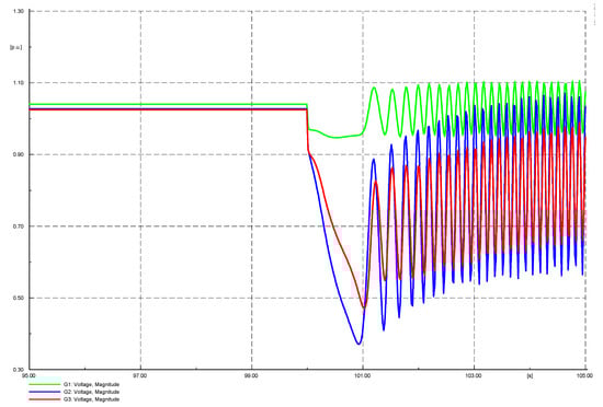 At present, CPF is the most commonly used voltage stability analysis method of large power systems [23,24]. In order to validate the results of the IEEE nine-bus network, we carried out transient stability studies in DlgSILENT. The voltage of slack bus 1, PV buses 2 and 3 remain constant until the scalar embedding parameter increases to . When time = 100 s, increase the load power to 2.641 times the initial value, we can see that the voltage of bus 1, 2, and 3 constantly oscillate during the subsequent iterative process, as shown in Figure 2. It proves that the system voltage will be unstable when it reaches the voltage stability limit, which is consistent with the calculation of CPF.