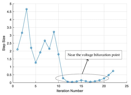 where is the maximum step size of the computed point and when is equal to , . The relationship between step size and the maximum step size for a practical two-bus network can be seen in the Table A1 in Appendix A.