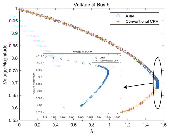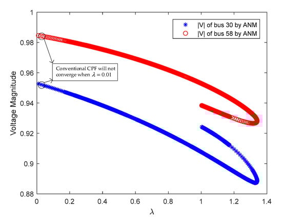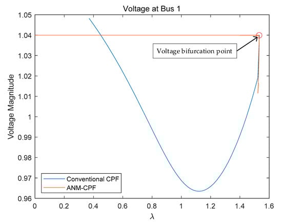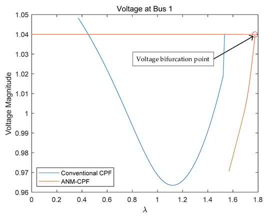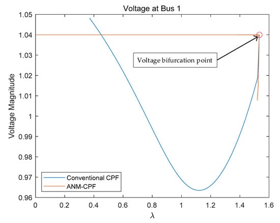 The above calculation results are calculated when the slack variable is in Equation (5). In order to further analyze the influence of slack variable value on the calculation result, and are taken successively. We selected the voltage magnitude of bus 1 for both methods to compare. The voltage bifurcation point calculated by ANM is marked in Figure 8 and Figure 9. The comparison results are as follows: