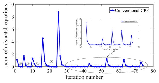 Conventional buses type switch logic methods in CPF, as the number of PV buses changing to PQ increases, the use of logical judgment inevitably increases the burden of calculation, even causing the power flow calculation failing or converging to the wrong solution. When , from Figure 11, we can see the PV-PQ bus switching strategy leads the conventional predictor-corrector power flow diverging in the large system, and the conventional predictor-corrector method first changed PV buses 59, 65, 103, 19, 34, 92, and 105 to PQ buses at position ①, then converged in five iterations. On sequential iteration, PV buses 49, 55, 56, 61, and 62 changed to PQ buses at position ② and converged in four iterations; PV bus 54 became a PQ bus at position ③; and, finally, PV bus 66 became a PQ bus at position ④. However, due to the number constantly oscillated during the iterative process, the conventional predictor-corrector power flow solution did not converge after 50 iterations from ④. When , the correct solutions are that PV buses 59, 65, 56, 55, 61, 62, 54, 49, 103, and 66 are changed to PQ buses. Compared to the real solutions, we can see that the conventional predictor-corrector method mistakenly changes the PV buses 19, 34, 92, and 105 to PQ buses because of false logic judgment, which leads to the wrong results during the iteration.