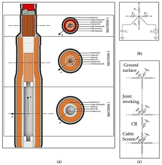 (a) Simulated cold-shrinkable joint (the cylindrical coordinate system used in the model is also shown), extracted from []; (b) Equivalent electrical circuit corresponding to each layer of the cable; (c) Detail of the equivalent network representing the contact resistance (CR).