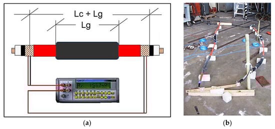 where Rs,T is the overall screen resistance measured by the digital meter according to the configuration in Figure 2a, r16 is the cable screen resistance per unit length (1.329 mΩ·m−1 for the tested cable-joint system), r100 is the joint stocking resistance per unit length (0.16 mΩ·m−1 for the tested cable-joint system), Lc is the length of the portion of the cable outside the joint, Lc,g is the length over which the screen continuity is carried out (corresponding to Section 3 in Figure 1a) and Lg is the joint length, as shown in Figure 2a. Measured Rs,T values, as well as the corresponding CR values calculated with (5), are reported in Table 1.