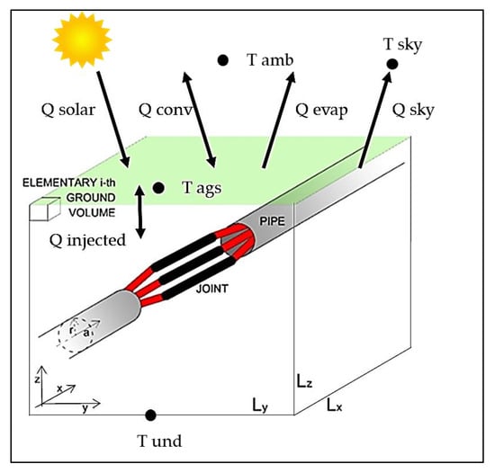 In Equation (6), λg is the thermal conductivity of the soil and cg,i is the volumetric heat capacity of the i-th volume of soil, nx, ny, and nz are the number of subdivisions, and Sx,i, Sy,i, and Sz,i are the cross sections of the i-th element along the x, y, and z axes, respectively.