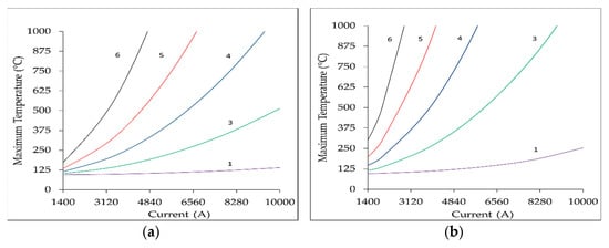 In order to recap simulation results carried out according to Table 7, a correlation is further presented. Figure 9 shows the short circuit current which causes heating up to a certain limit temperature (i.e., 250 °C, 500 °C, 750 °C, and 1000 °C) as a function of CR value. Moreover, different fault clearing times have been considered; notably, 120 ms and 320 ms are reported by Figure 9a,b, respectively.