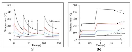 Figure 5 shows thermal transients simulated along the SCJ and the cable screen with IF = 3 kA (the average value of IF in []), using the autoreclosure scheme corresponding to UC A1 in Table 7 and considering CR values of Table 6. The whole thermal transients in SCJ for cases 1, 4, 5, and 6, as well as the thermal transient in cable screen for case 3, are reported in Figure 5a. Figure 5b shows a zoom of the same trends of Figure 5a in the timeframe of 0–2 s, in order to show the two temperature peaks corresponding to the 1st and the 2nd opening of the CB, which are not distinguishable in Figure 5a. In these cases, simulations show that SCJ does not reach dangerous temperatures if CR is lower than 3.65 mΩ, thus not impairing or breaking the joint. The trend of cable screen temperature is reported only for the simulation of case 3, since in all cases this trend is very similar to the temperature trend along the SCJ; however, it is worth noting that in case of a perfect screen contact (i.e., CR nil), the screen reaches temperatures higher than the joint because of its smaller section (not reported in other simulations). During the most severe simulated thermal transients (as in case 4, case 5, and case 6 of Figure 5), the time instant when the maximum temperature is detected corresponds to the 2nd opening of the CB: this result is consistent, since the time period between the first and the 2nd opening of the CB is very short and, consequently, temperature decreases in a negligible way.