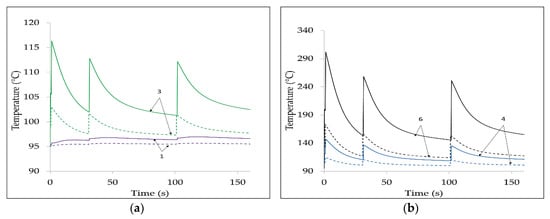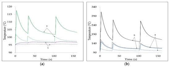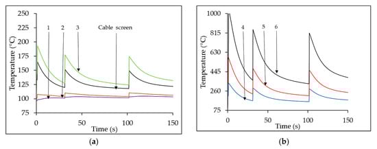 Thermal transients for IF = 3 kA (UC B2). (a) Cases 1, 2, and 3; (b) Cases 4, 5, and 6.