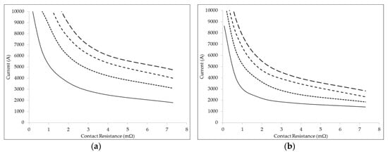 On the contrary, if the CR reaches values of some milliohms (such values have been measured in healthy joints in operation, as reported in []), realistic ground fault current values are able to damage and/or to break the joint, depending on fault clearing time and CR value. Parametric analyses, as reported in Figure 4 and Figure 9, show that for CR values of about 2 mΩ, IF values of about 4 kA are detrimental even for fast fault clearing times (120 ms); with larger CR values (about 6–7 mΩ), CCFs practically always cause an unacceptable heating of the joint.