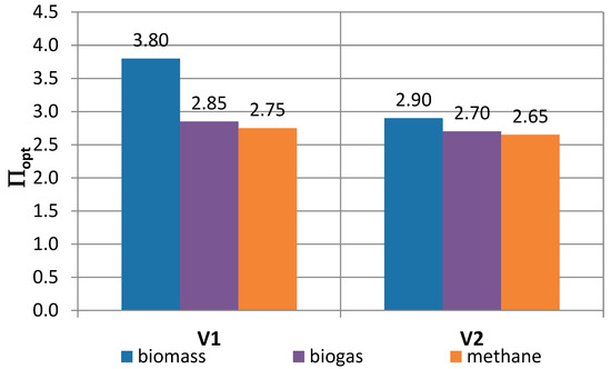 Calculations of two variants of cycles were performed (Figure 1 and Figure 2) for three fuels with different lower heating values (Table 4). The reference was made to the results for methane as a comparative fuel. For each of the analyzed variants, the compression ratio was optimized to obtain maximum efficiency. The effect of the compression on the value of the relative efficiency (referred to the maximum value) for three fuels used in variant 1 is shown in Figure 3, and for variant 2-in Figure 4. As can be seen, the calorific value shows an effect on the optimal compression (maximum efficiency) only for variant 1, whereas in variant 2 the type of fuel has a little effect on the optimal compression value. This is confirmed by the results shown in Figure 5 (optimal compression values for different types of fuel and both variants).