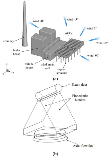 Schematics of the dry cooling system (a) air-cooled condensers (ACCs) and main buildings, (b) single condenser cell.
