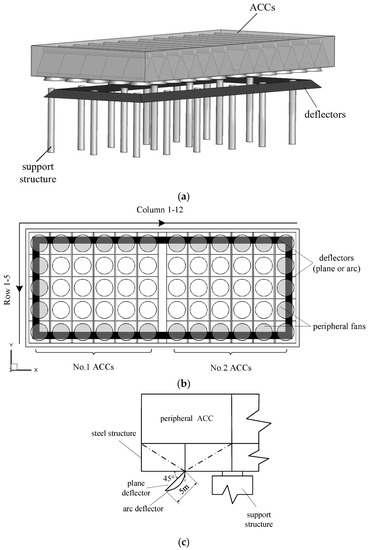 The literature review shows that the performance of ACCs, especially the windward ones, can be improved by using windproof devices, such as air deflectors. However, some issues still remain obscure. Firstly, most of the previous work was carried out under windy conditions in a specific wind direction. But, the wind direction can dramatically affect ACC performance [4]. Although several wind directions were taken into account in the literature [14], the ACCs were isolated from the main buildings, such as the boiler and turbine houses, which is impractical because of the significant influences of main buildings on ACC performance under windy conditions [4,5]. In addition, the variation in hot air recirculation with air deflectors was rarely mentioned in previous work. Therefore, it is of necessity to carry out further research to clarify the impacts of air deflectors on the performance of ACC, including the hot air recirculation, in various wind directions. Moreover, the aforementioned deflectors focused on plate patterns, and few investigations of an arc air deflector were developed. But, compared to the plate air deflectors, the arc ones can provide a larger flow-deviation angle to surpass the off-axial airflow.