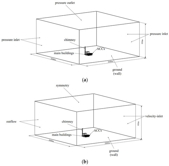 The direct dry cooling system employed in a typical 2 × 300 MW power generation unit consists of two units of ACCs, and each has 30 (5 × 6) condenser cells with a rectangular layout, as depicted in Figure 1a. Thanks to the symmetric configuration of the power plant, five representative wind directions, ranging from −90° to 90°, are taken into consideration, of which the interval was 45°. The main buildings such as the boiler, turbine houses, and chimney were taken into account, but the other constructions were ignored. Each ACC contained two crossed, wave-finned, flat tube bundles with an axial flow fan below them, as shown in Figure 1b. The arrangement of the ACCs and air deflectors are presented in Figure 2a, where the air deflectors are arranged below the peripheral ACCs. As shown in Figure 2b, the condenser cells are numbered from 1 to 5 in the rows and 1 to 12 in the columns. Figure 2c gives the geometry and location details of air deflectors, shaped in plane or arc patterns, and installed below the steel support of the peripheral ACCs. The arc deflector was in the shape of a quarter-circle, and its chord was just the plane deflector with a width of 5 m and an inclination angle of 45°. To eliminate the unrealistic influence of the domain borders on the airflow fields, it was necessary to develop a large enough computational domain with a size of 2000 × 2000 × 950 m, as displayed in Figure 3.