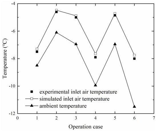 In a real power generation unit with a dry cooling system, the whole ACC is extremely complex with a large-scale structure, so it is hard to achieve the performances of ACCs based on model tests. As an alternative way, field measurements have been used to study the ACC heat transfer and flow features. In our previous works, a spot test for the ACCs in a 4 × 600 MW power generation unit was performed [4,22], by which a typical condenser cell inlet air temperature was measured on the condition of full-power output. According to the geometry configuration of the ACCs and ambient conditions, a 3-D simulation was established and carried out. Figure 4 shows the simulated and experimental inlet air temperatures, both of which exceeded the environment temperature and were very close to each other. Further, another scaled model test of a single condenser cell for a 600 MW power plant was carried out [23]. Table 3 lists the comparison results between the simulation and test results. For the heat transfer rate, the average and maximum values of the relative error were 7.19% and 10.57%, respectively, which can be allowed in actual projects. In this work, the numerical and modeling ways were just the same as those taken by the numerical simulations above, indicating, indirectly, that the simulation approaches can accurately predict the thermal-flow performances of the current ACC.