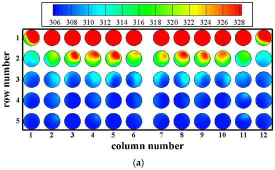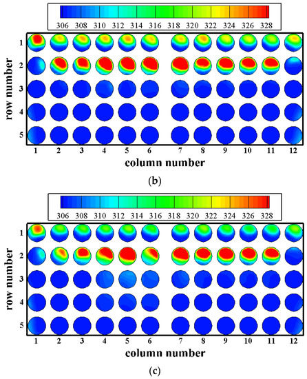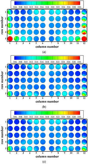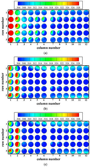 Inlet air temperatures (unit in K) of fans at the wind speed of 16 m/s in the wind direction of −90°. (a) Original, (b) with plane deflectors, and (c) with arc deflectors.