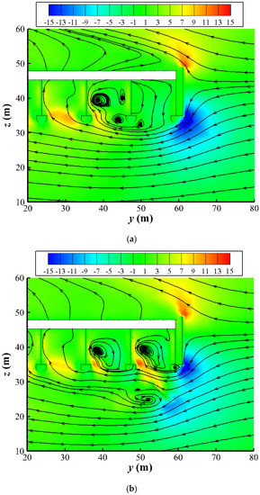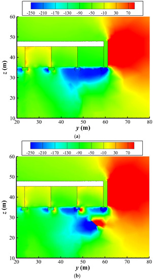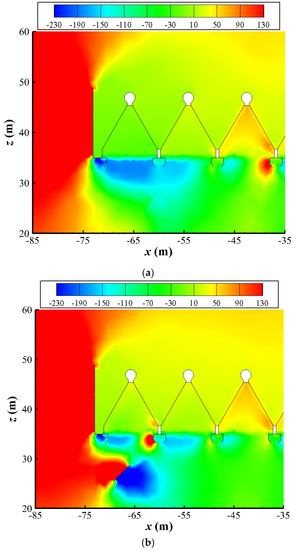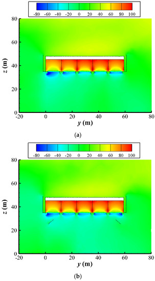 Figure 9 gives the local pressure of the first three upwind condenser cells in row 4. Similar to Figure 6a, the whole C1 fan inlet zone, as well as half of the C2 fan inlet zone, was dominated by low pressure under strong crosswinds. With the generation of high pressure at the windward side of air deflectors, the low pressure near the upwind condenser cell inlet reduced a lot. Same as in Figure 6, the pressure distribution was improved with arc deflectors. As for the C2 fans, however, the low pressure zone expanded at the fan inlet.