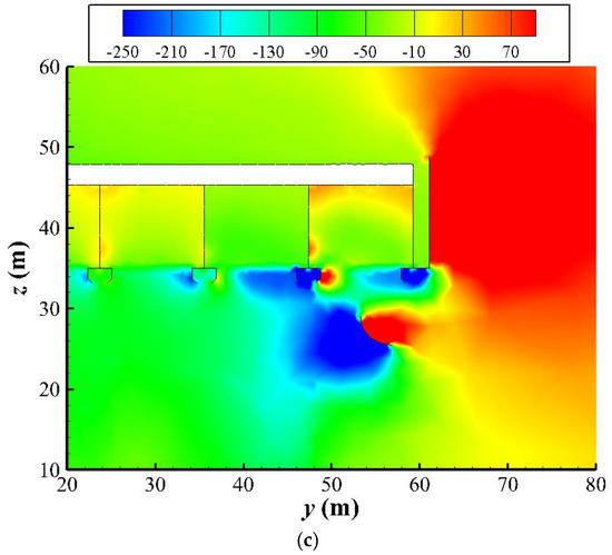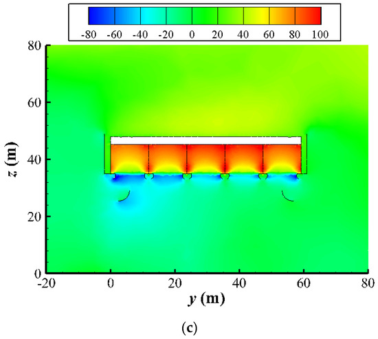 Static pressures (unit in Pa) of windward ACCs in column 9 at the wind speed of 16 m/s in the wind direction of 90°. (a) Original ACCs, (b) ACCs with plane deflectors, and (c) ACCs with arc deflectors.