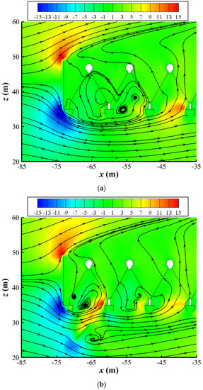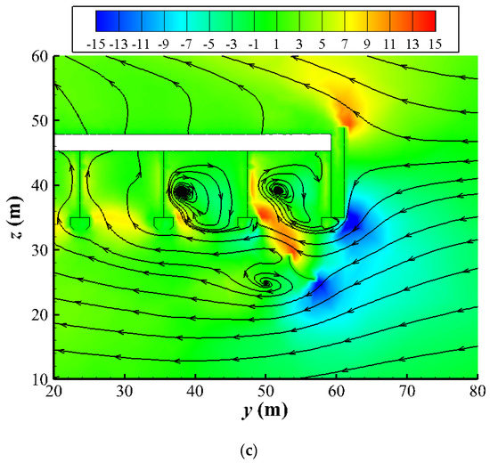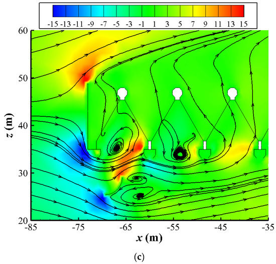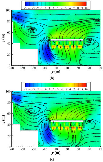 z-velocity (unit in m/s) and path lines of windward ACCs in column 9 at the wind speed of 16 m/s in the wind direction of 90°. (a) Original ACCs, (b) ACCs with plane deflectors, and (c) ACCs with arc deflectors.