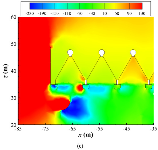 Static pressures (unit in Pa) for windward ACCs in row 4 at the wind speed of 16 m/s in the wind direction of 0°. (a) Original ACCs, (b) ACCs with plane deflectors, and (c) ACCs with arc deflectors.