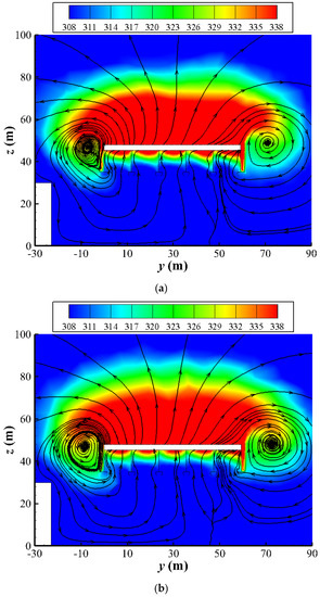As examples, three wind directions with the values of −90°, 0°, and 90° at a wind speed of 16 m/s were used to present the details of temperature, pressure, and flow fields near the cooling system with and without air deflectors.