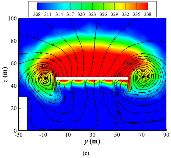Temperature distribution (unit in K) and path lines of ACCs in column 9 at the wind speed of 16 m/s in the wind direction of 0°. (a) Original ACCs, (b) ACCs with plane deflectors, and (c) ACCs with arc deflectors.