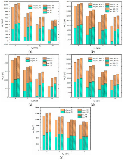 Comparing the results of ACCs with arc and plane deflectors, it is not difficult to find that the air mass flow rate through the first column or row condenser cells with arc deflectors was greater than that with plane deflectors, which is coincident with the results shown in Figure 7, Figure 10, and Figure 14. Moreover, as for the second column or row ACCs along the wind direction, the results were the opposite. Fortunately, the air flow rate sum of upwind columns and rows with arc deflectors was more favorable for most cases.