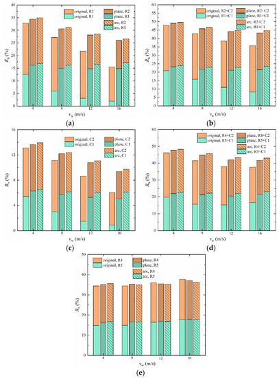 Figure 16 shows the Rh at various wind speeds and in various wind directions. It can be seen that the Rh decreases with an increasing wind speed in most cases, showing that the thermal performance of the upwind condenser cells were weakened as the wind speed increased. For most cases, except when the wind direction was 90°, the Rh of the first upstream column or row condenser cells with air deflectors was always bigger than that without air deflectors. However, for the second column or row condenser cells in the wind direction, the Rh decreased a lot. For example, as shown in Figure 16a, when the wind speed was 16 m/s, the Rh of R1 in the original ACC was about 2%, which is far less than the average level of 20%, and it rose up to about 17% in ACCs with arc deflectors, close to 20%. Nevertheless, for the R2 condenser cells, the Rh was about 14% without air deflectors, but it dropped nearly to 9%. The sum of R1 and R2 Rh values in the ACCs with deflectors was higher than that in the original ACCs in most cases. When the wind direction was 90°, the Rh varied a little and even dropped because of the blocking effects of the main buildings. As mentioned in Figure 12, the backward fan inlet temperature dropped a little, showing that the thermal performance of the backward condenser cells with air deflectors was improved. Subsequently, Rh could decrease. Furthermore, as the wind speed increased, the difference in the Rh sum between the ACCs with and without air deflectors gradually increased. The difference in the Rh sum of R1 and R2 between original ACCs and ACCs with arc deflectors was about 2% at a wind speed of 4 m/s, but it increased to about 11% when the wind speed was 16 m/s.