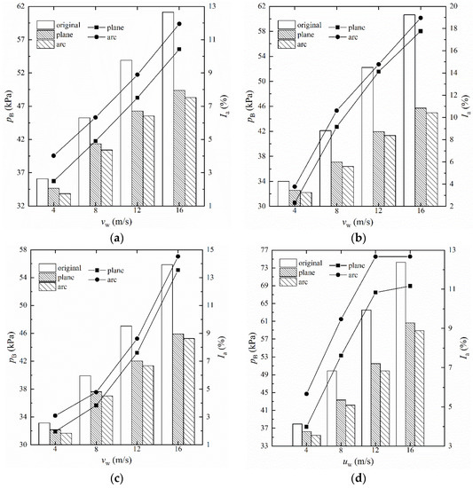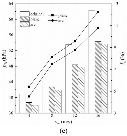 Figure 17 shows the variations of Ia and pB under various windy conditions, where the bar and curve represent the pB and Ia, respectively. In general, as the wind speed increased, Ia increased, showing that the air deflectors led to an incremental total mass flow rate under strong crosswinds. With arc deflectors as shown in Figure 17a, Ia at the wind speed of 4 m/s was about 4%, and it increased to about 12% at a wind speed of 16 m/s. Furthermore, the Ia of ACCs with arc deflectors was always greater than that with plane deflectors, showing that the arc deflectors could lead more air to flow into the ACCs. For the pB, whether with or without air deflectors, it always increased with increasing the wind speed, indicating that the crosswinds deteriorated the cooling performance of the ACCs. With air deflectors, the pB decreased clearly, and the difference of pB without and with air deflectors expanded as the wind speed rose. For instance, as displayed in Figure 17a, the difference of pB without and with arc deflectors was about 2 kPa when the wind speed was 4 m/s, but it increased to about 13 kPa when the wind speed was 16 m/s. Conclusively, the unit back pressure with arc deflectors was always lower than that with plane deflectors under windy conditions, showing that the arc deflectors can help the power generating unit to operate at a higher energy efficiency.