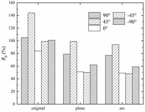 Taking the wind speed with a value of 16 m/s as an example, Figure 18 displays the change of Rp with wind direction for ACCs with and without air deflectors. In general, in the wind direction of 45°, the performance of the ACCs was most unfavorable, which was mainly attributed to the combined effects of crosswinds and main buildings. For instance, the back pressure for ACCs without air deflectors in the wind direction of 45° was over 2.4 times than that in the absence of winds, and even with arc deflectors it only dropped to about twice over. Fortunately, with air deflectors, the performance improvements for ACCs were most favorable when the wind directions were equal to 45° and −45°, and the Rp dropped to about 50% with arc deflectors.