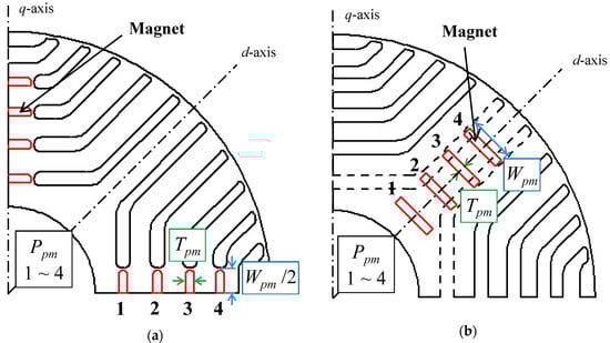 Rotor configurations: (a) The first permanent magnet (PM) arrangement (Type 1); (b) The second PM arrangement (Type 2).