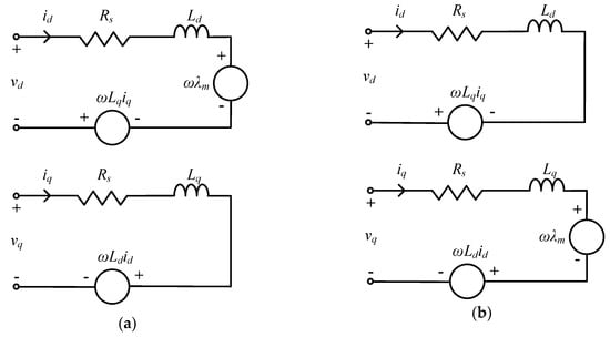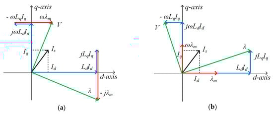 Figure 2 presents the equivalent circuits for the Type 1 [27] and Type 2 motors. As can be seen, the two types of motors have a difference in PM flux linkages. The phasor diagrams for Type 1 [9] and Type 2 are illustrated in Figure 3a,b, respectively, with the winding resistance being neglected [9,29]. Therefore, the voltage equations can be further expressed as: