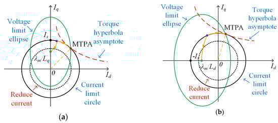 The field weakening theory has been discussed in References [32,33] where ideally, the infinite speed could be achieved when the value of the armature current Is is equal to the characteristic current Ich. Practically, to increase the CPSR, Is should be selected as close to Ich as possible [32,34]. The motors in this paper have Is greater than Ich due to low the PM flux linkage by the limited PM quantity, as shown in Figure 4, where Ich = λm / Lq for Type 1 and Ich = λm / Ld for Type 2. There are two potential methods for improving the CPSR. The first method is to increase Ich by using stronger or more magnet (higher λm) or changing the rotor configuration to reduce the q-axis or d-axis inductance for Type 1 or Type 2, respectively. However, this would lead to a redesign of the motors [35]. The second method is to reduce Is (active reduction), as indicated in Figure 4, which however, should face a direct reduction of motor torque and power [24]. On the other hand, these motors can be operated in the maximum torque per voltage (MTPV) mode in which the current is reduced (passive reduction) when the speed increases. This would result in a partial overlap in the power-speed curves between the active and passive reductions of the excitation current in the field weakening region at high speed. This is explained in Section 4.3.