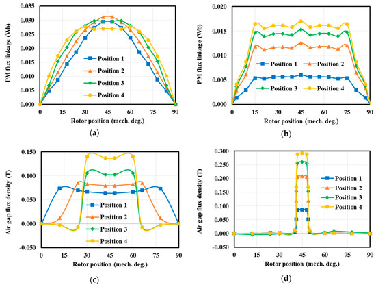 The PM flux linkage and air-gap flux density at no-load: (a) The PM flux linkage for Type 1; (b) the PM flux linkage for Type 2; (c) the air-gap flux density for Type 1; (d) the air-gap flux density for Type 2.