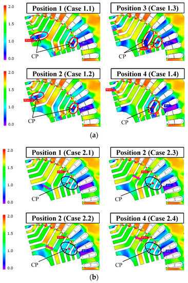 where Bu is the lowest flux density at the central point (CP) of the main unbalanced magnetic distribution zones as highlighted in Figure 6, and Brotor is the average flux density in the rotor core obtained from a number of selected points (40 points in this paper) evenly spread out on the rotor core, as illustrated in Figure 7. The selection of these points only aims to represent the average flux density in the rotor without a particular criterion. Note that the determination of Bu and Brotor does not take into account the singularities of the magnetic field, which do not represent the general magnetic distribution although these points are significant for saliency and the torque of motors [18,37]. The higher the flux balance index is, the better and more balanced magnetic distribution is in the rotor. The flux balance indices for various the PM positions of both types of motors are shown in Table 4. As can be seen, for Type 1, the flux balance index increases in the order of PM positions from 1 to 4 [Cases 1.1 to 1.4 in Figure 6a], indicating that the magnetic distribution would be better when the PM moves outward. In contrast, for Type 2, the unbalanced zones and the unbalanced condition do not seem to change as the PM position changes [Case 2.1 to 2.4 in Figure 6b]. This may be due to the fact that for such a configuration, the PM flux is not obstructed by the flux barriers. Furthermore, this unbalance is only caused by the armature reaction at load condition. As a result, Type 2 has a greater flux balance index than Type 1 does, meaning that the arrangement of PMs in Type 2 can be a decent choice to help improve the balance of the magnetic field.