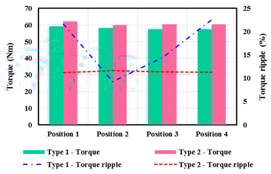A brief comparison of the torque and torque ripple between the various PM positions of both types is shown in Figure 8. It can be seen that the torque ripple for Type 1 significantly changes with the PM positions, but this does not happen in Type 2. As previously mentioned, for Type 1, both the flux balance index and the locations of unbalance zones vary with the PM position, and the most unbalanced area occurs on the segment near the PM wherever it is placed (Figure 6a and Table 4). For Type 2, in contrast, both the flux balance index and the unbalanced zones seem to be independent of PM position (Figure 6b and Table 4). This indicates that the magnetic distribution in a Type 2 rotor is insensitive to the PM position, and this accounts for the invariant torque ripple with PM positions. In other words, for Type 1, the selection of PM position in a rotor should consider its effect on the magnetic distribution and thus torque ripple. For Type 2 motors, the torque ripple should not be a major concern for the placement of the PM. Note that, the torque output level is not affected significantly by the PM positions and motor types.