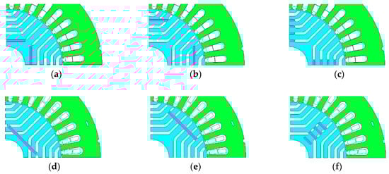 From the previous discussions, the comparison for various numbers of the PM layers as well as various the PM positions is presented. In this section, to fully investigate the performance and characteristics, six models broken down into the two types of motors discussed in Section 2 are created and shown in Figure 10, where Models 1, 2, and 3 are categorized in Type 1 and Models 4, 5, and 6 belong to Type 2. In these models, Models 1 and 4 have the PMs installed at position 1, Models 2 and 5 at position 4, and Models 3 and 6 at all the positions. As the previous analysis, the PMs are all magnetized in the parallel pattern. Note that these models can be treated as proper motors and the effect of various PM layouts (inmost, outmost and multiple layers) on motor inductances and torque production can be investigated through these rotor arrangements. All the models have the same main specifications and the PM thickness/volume. Their PM positions and dimensions are given in Table 5. Note that, the PM thickness is 1.5 mm, which is considered to be manufacturable [23,26].