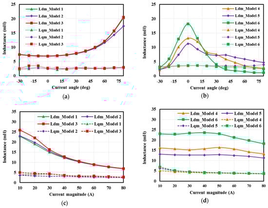 The inductance variation with the phase angle and magnitude of the current are shown in Figure 11, where the current angle was set to be zero for Figure 11c,d. Note that, these are the motor d- and q-axis inductances (Ldm and Lqm) with the presence of PMs rather than the ones without considering the PM flux, i.e., Ld and Lq (stator inductances) in Equations (3)–(8).