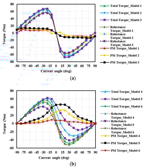 The torque production and torque components (i.e., PM/reluctance torques) are illustrated in Figure 12 and Table 6. To obtain the curves of torque versus the current angle using FEA, the initial rotor position can first be set up and based on that which the current is applied. Then, the current angle is regulated and swept through the prescribed range so that the output torque can be calculated for each current angle. As shown in Figure 12a, the torque production and torque components for all the models of Type 1 are almost similar. Of these cases, the multiple PM layers one, i.e., Model 3 is the best choice for the sake of its highest achieved total torque and PM torque ratio, as presented in Table 6. However, Model 1 should also be further considered since its torque is only slightly lower, taking the advantage of inmost PM arrangement, as discussed in the previous analysis. As shown in Figure 12b, the torque production and components are diverse for the models of Type 2, which agrees with the previous discussion. The case with the most outward PM and fewer PM layers, i.e. Model 5 would the best choice for its highest achieved total torque by making the most utilization of the PM compared to Models 4 and 6, as presented in Table 6. Furthermore, as presented in Table 6, the torque production of all the models of Type 1 is higher than every model of Type 2. This seems to indicate that the models of Type 1 have better torque production than Type 2. However, the high PM torque and its easy regulation by applying the various PM configurations (i.e., large PM torque difference between these investigated models) is a significant advantage of Type 2. On the other hand, for the Type 1 models, the torque is brought down to zero when the current angle is zero (i.e., Id is zero) while for Type 2, the torque can only reduce to zero at the high current angle since the PM torque and the reluctance torque offset each other. Therefore, for the Type 2 motors, the armature excitation, i.e., the stator current Is can be easily used to regulate the torque characteristics.