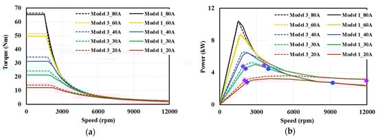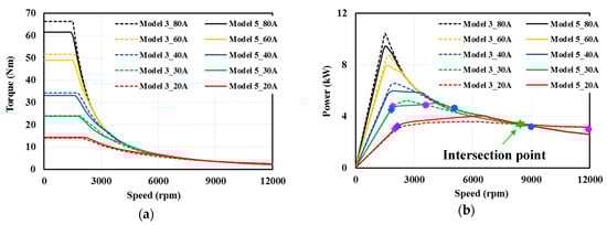 As previously mentioned, the armature current Is can be reduced to be close to Ich to improve the speed range. The relationship between Is and Ich as Is of Models 1, 3 and 5 varies and is presented in Table 7, where as expected, the Is/Ich ratio generally decreases as Is decreases. Furthermore, Figure 13 and Figure 14 show the comparison of torque-speed and power-speed curves between Models 1, 3 and 5, where a 220 V DC voltage is applied. In these curves, the rhombuses and circles denote the start- and end-points of the constant power region. The pink ones are for Model 3 and the blue ones are for Models 1 or 5. As can be seen in Figure 13 and Figure 14, for the three models, the power-speed curves tend to converge at high speed and are partially overlapping. When Is reduces to be close to Ich, the CPSR of the motors improves but the torque and the power suffer some reduction. In Figure 13, the torque and power-speed curves of Model 1 are constantly slightly lower than Model 3 for the same Is although the highest torque production is obtained when the PM is at the inmost position in the rotor. In contrast, although at a low speed operation, the torque production of Model 5 is lower than Model 3, but the difference decreases as Is decreases. This results in an enhancement of the power-speed curves and CPSR for Model 5, which then surpasses Model 3, as seen in Figure 14. However, if Is continues to reduce, e.g., Is = 20 A, the CPSR of Model 5 cannot maintain the superiority to that of Model 3. This can be observed via the power-speed curves where there is an intersection point between these curves. The power corresponding to this point is denoted the intersection power, Pi. For such an intersection, if the required output power is greater than Pi, the CPSR of Model 5 is better than Model 3 and vice versa. Note that, as can be seen in Figure 14, this intersection point locates at the overlap of the MTPV control [33] regions of the target models so that this point no longer depends on the required current, but on the electromagnetic properties or the motor construction, i.e., PM flux linkage, inductance and Ich.