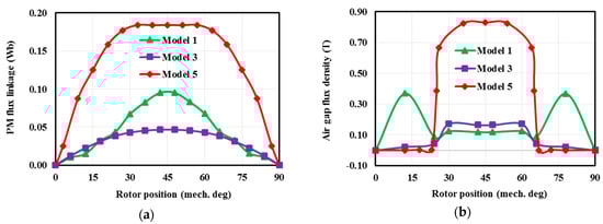 The no-load PM flux linkage and air-gap flux density of Models 1, 3 and 5 are shown in Figure 15. It can be seen that when the PM width increases, the PM flux linkage and air-gap flux density of Type 2 (Model 5) increases significantly. This demonstrates the intensification of the magnetic field that is enabled by placing the PM along the d-axis instead of the q-axis. This can also explain the high PM torque ratio of Model 5 as presented in Table 6.