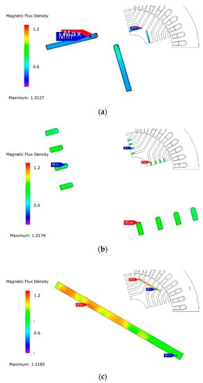 Flux density in PM at the 120 °C of temperature: (a) Model 1; (b) Model 3; (c) Model 5.