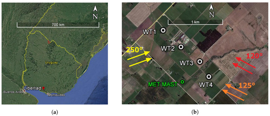 As a case study we simulated a 7.7 MW onshore wind farm called ’Libertad’, which has been operating since August 2014 by Ventus (www.ventusenergia.com). It is located in the south of Uruguay (Figure 2a) and consists of four Vestas V100 Wind Turbines (WT), two of them with 1.9 MW as rated power (WT1 and WT2) and the other two with 1.95 MW (WT3 and WT4). The wind turbines have a rotor diameter of 100 m, a hub height of 95 m, and a rated rotor speed of 14.9 RPM. There is a meteorological mast with anemometers at 95 m, 80 m, and 60 m, and wind vanes at a height of 93 m and 58 m near the wind turbines (Figure 2b). The surrounding terrain is plane, with no significant slopes according to annex B of IEC 61400-12-1 Standard. The wind farm has already been simulated and results were presented in [31,32,50].