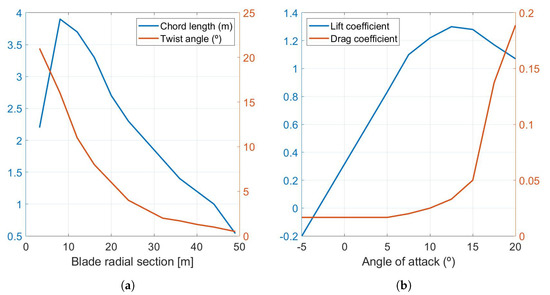 where is the air density, is the relative velocity, c is the chord length, and are the lift and drag coefficient respectively, is a unit vector in the direction of the lift force, is a unit vector in the direction of the drag force, and is the length of the radial section. Equation (5) requires the chord length and twist angle of the blades to be known, as well as their aerodynamic properties (lift and drag coefficients) in each radial section. The chord and twist angle as a function of the rotor radius are obtained from the wind turbine model, while the lift and drag coefficients are computed from tabulated data of the airfoils used.