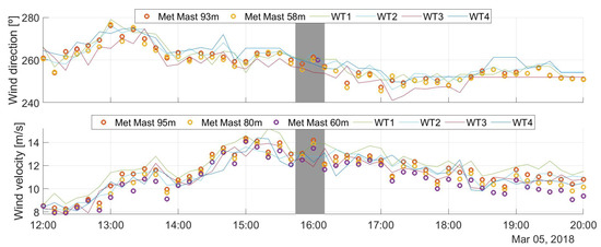 Wind direction (top) and wind velocity (bottom) ten minute averages, acquired by the meteorological mast and the four wind turbines on 5 March, 2018. The grey area indicates the simulated period when the numerical results are compared with 1 Hz of SCADA data (not shown in this figure).