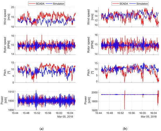 Looking at the time series, the pitch signals take values above the minimum (−2) during the entire 1200 s period. This shows that the pitch-controller was operating to regulate the angular speed of the rotor, which in turn was fluctuating around its rated value in both the SCADA and simulation signals. As a consequence, the power output of both wind turbines was being controlled around its rated value, as desired. Large peaks were observed in the electric power signal from the SCADA of WT2, both above and below rated speed, which lasted for around 10 s. These peaks may be associated to a sudden change in wind speed, as the pitch angle acted accordingly prior and after the occurrence of these peaks. This in not captured in the simulation, where the wind speed did not change in that way over time. The electric power peaks could also be caused by the operation of electric components (e.g., the inverter or the generator), which we did not consider in our simulation.