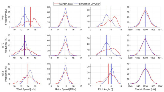 Histograms of wind speed (m/s), rotor angular speed (RPM), pitch angle (), and electric power (kW) from the SCADA data and simulation of wind turbines WT1, WT2, and WT3. Inflow condition of the simulation: Wind direction 250 (no wake interaction) and wind speed above rated. Vertical dashed lines represent the mean value of each signal.