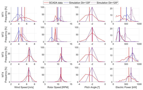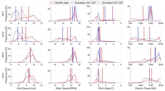 It should be mentioned that, even though in the real event the wind direction was changing, we represented this situation by computing two independent simulations subject to constant wind directions, one at 120 and the other at 125. As pointed out in [58], small changes in wind direction may have large impacts on power production, affecting the wind turbine’s operation. Figure 7 shows the histograms of wind speed, angular speed of the rotor, pitch angle, and electric power of the four wind turbines, comparing 1 Hz of SCADA data and the results of the two simulations. For this case, good agreement between the simulations and SCADA data could be observed for WT3 and WT4, which were the ones that not affected by the wake of other turbines. Furthermore, for that reason, notice that the results of the two simulations were similar for these wind turbines. In both simulations the pitch angle of these wind turbines was frequently in its minimum value, showing that the wind turbines were operating at region 2, trying to optimize their power production. Consistently, the rotational speed of their rotors was below its rated value as well as their power output.