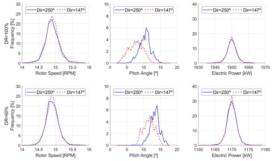 Figure 10 compares results of WT3 operation at 250 and 147 with wind speed at the inlet and hub height of 12 m/s, showing the histograms of rotor speed, pitch angle, and electric power. Two constant de-rate commands were considered: 100% (equivalent to rated power) and 60% . As there was enough wind velocity to reach rated power, for both wind directions, the required levels of electric power could be accomplished, while the rotor speed oscillated around its rated value in both cases. Regarding the pitch angle, higher values were observed at wind direction 250 than at 147 because in the latter case, WT3 was at the wake of WT4 with less available power. Furthermore, higher pitch values were adopted for the 60% de-rate command than for the 100%, for the same wind direction (e.g., 250).