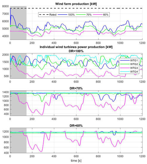 We performed simulations considering several de-rate values for each wind turbine and another wind direction, 147 where WT3 is clearly affected by the wake of WT4 (see Figure 2b). Figure 9a,b show the operation of WT3 and WT4 respectively, at 147, with span-wise averaged velocity of 9 m/s at hub height, considering 6 de-rate commands for both wind turbines: 100%, 90%, 80%, 70%, 60%, and 50%. In the case of WT3 it is clearly noticed that the wind turbine did not reach the required de-rated power, except for some moments when DR = 50% and DR = 60%, when there was enough available power on the wind flow. Furthermore, it can be noticed that the power production of WT3 decreased with higher de-rate values of WT4, as there was less available power due to its wake. The rotor speed was regulated and the pitch angle was kept constant at its minimum value most of the time.