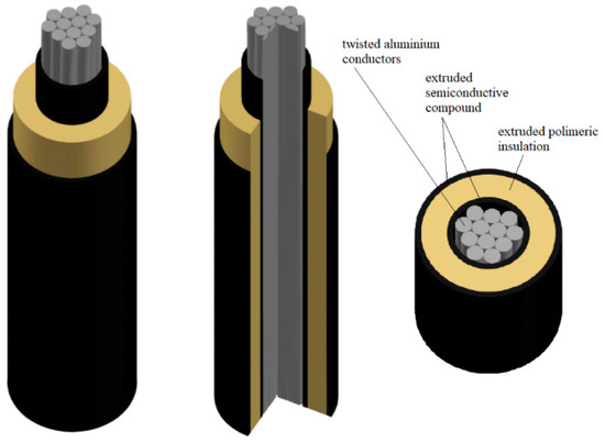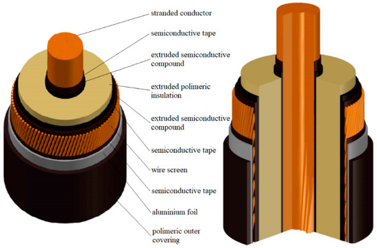 In Figure 1, the typical stratigraphic distribution of materials in an HVDC cable for land application is shown while, in Figure 2, a mini-cable is shown. The latter is typically devoid of the outer layers of the external semiconductor in order to easily perform space charge measurements. This is commonly considered a good solution for the qualification of semicon-dielectric-semicon compounds [7,8].