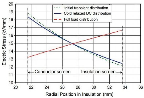 Example of no-load and full load electric field distribution in HVDC cable—figure reproduced from [9].