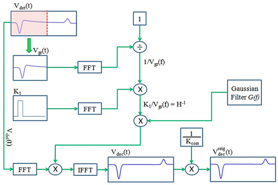 The measurement output in the above described conditions involves two peaks with different heights due to the partial absorption of the pulse generated at the farthest electrode. The higher peak measured at the oscilloscope can be compared with the calculated value of in order to evaluate the transfer function. The deconvolution process in PEA measurements, schematized in Figure 6, is extensively described in [19].